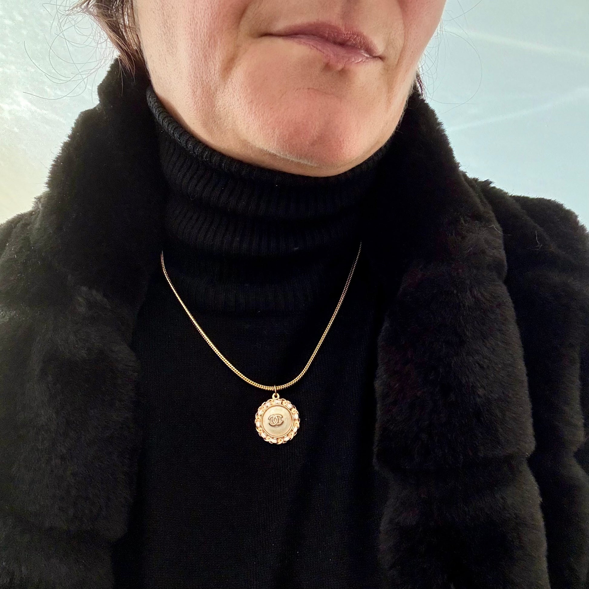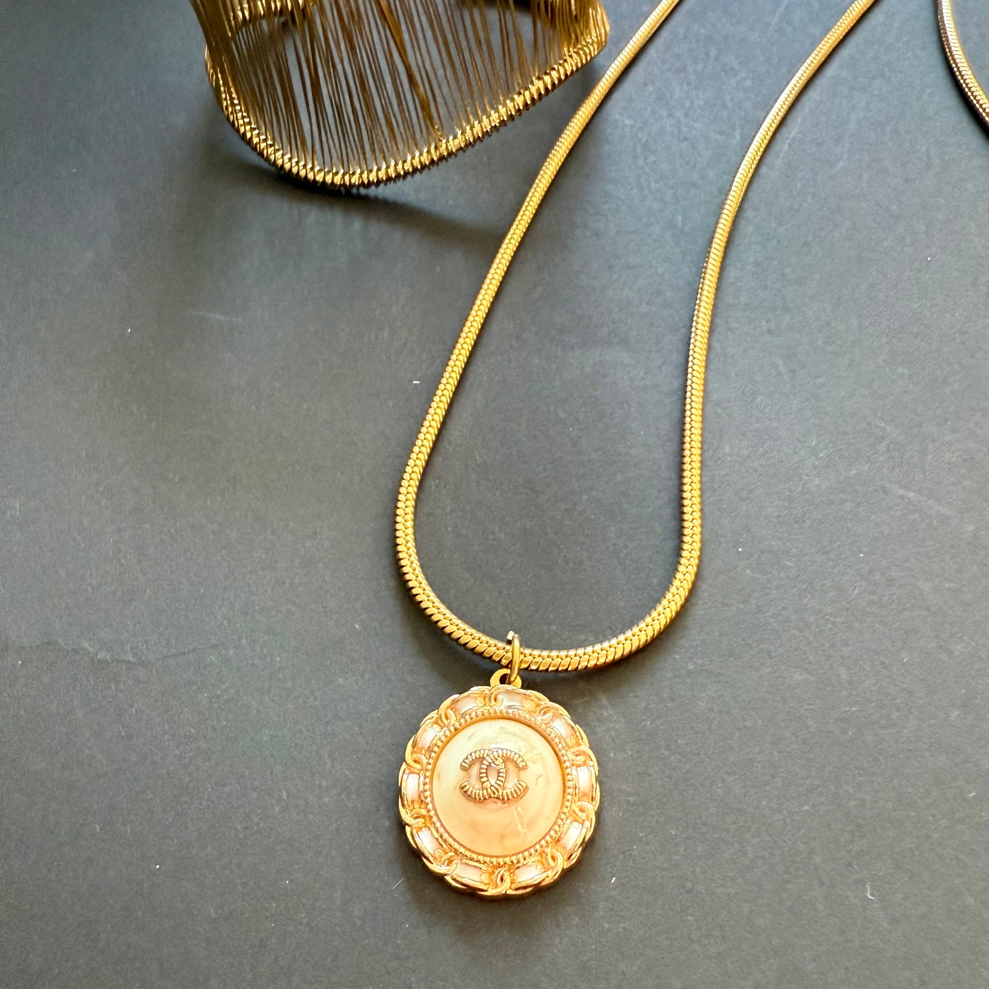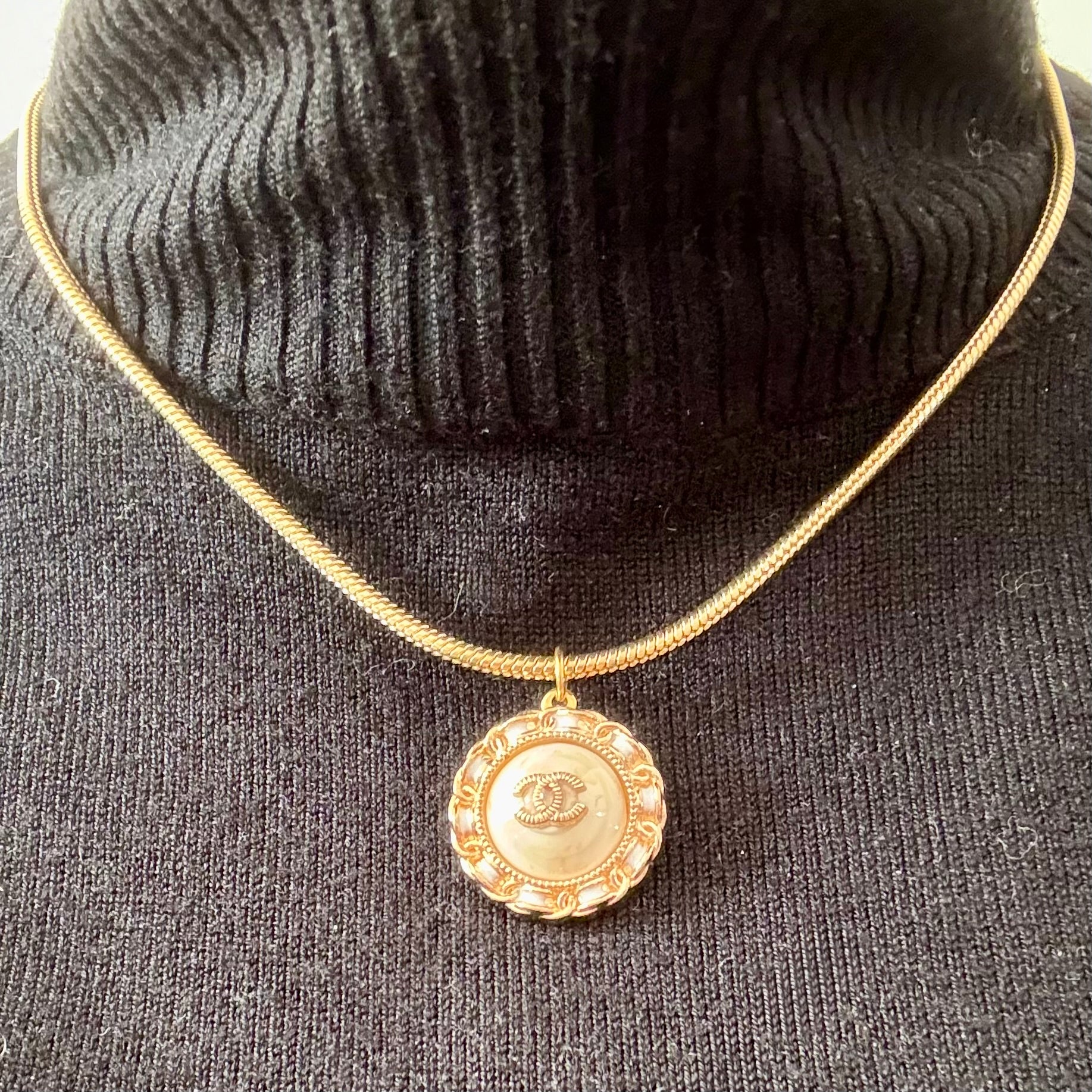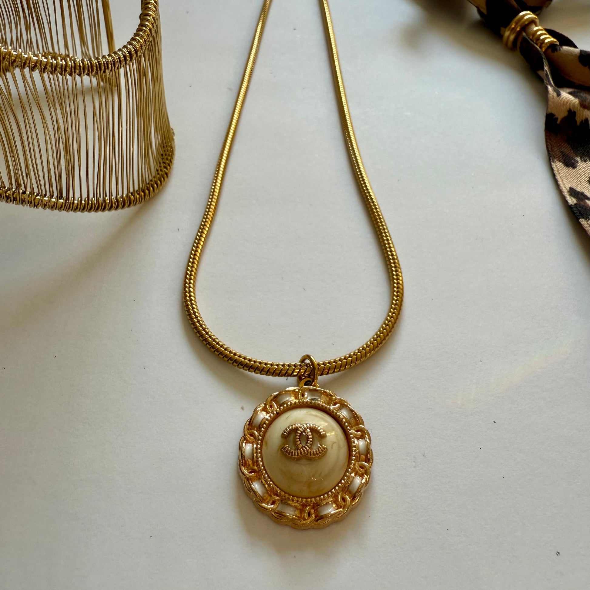 Botón auténtico de la marca de lujo Chanel transformado en un collar upcycled con colgante: botón redondo, de color blanco, con el icónico logo doble C en dorado.