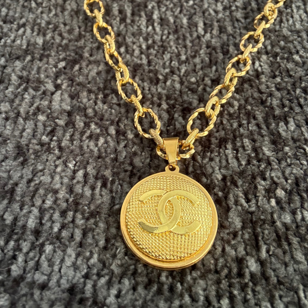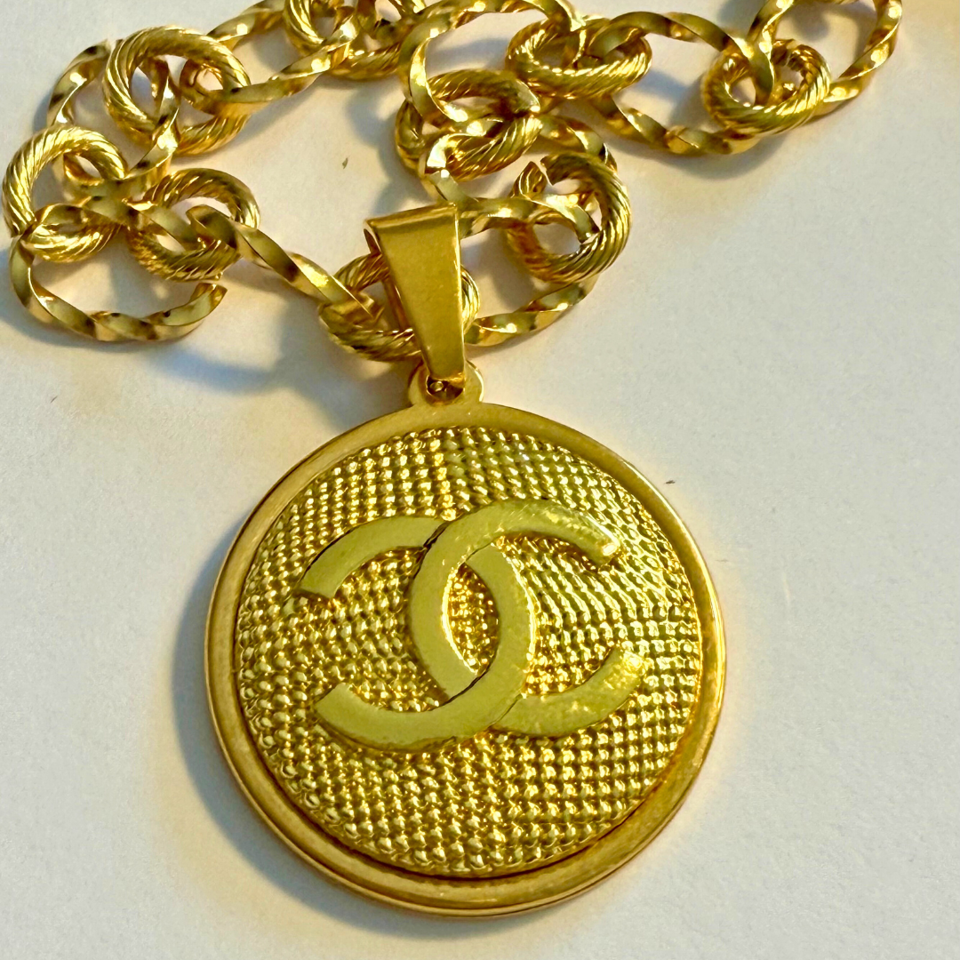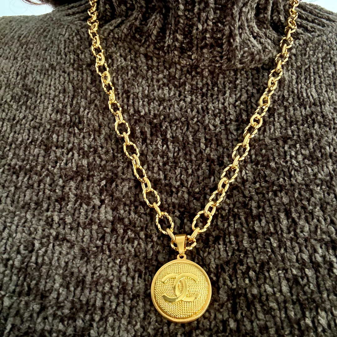 Authentic button from the luxury brand Chanel transformed into an upcycled sautoir necklace, round button, gold-colored, with the iconic CC logo embossed.