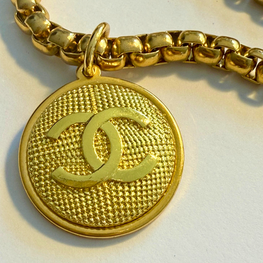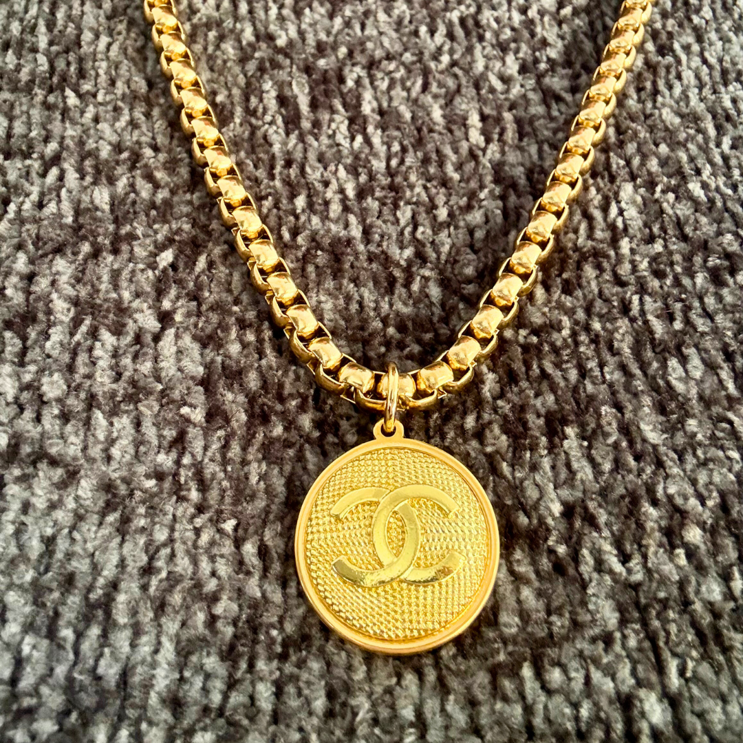 Authentic button from the luxury brand Chanel transformed into an upcycled sautoir necklace, round button, gold-colored, with the iconic CC logo embossed.