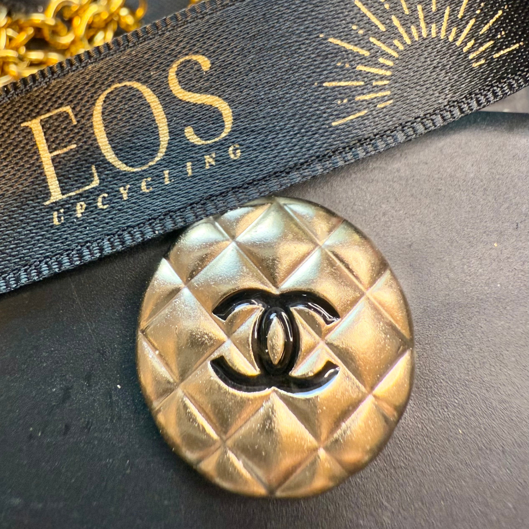 Authentic button from the luxury brand Chanel transformed into an upcycled necklace with a pendant, round button, gold-colored, with the iconic double C logo in black.