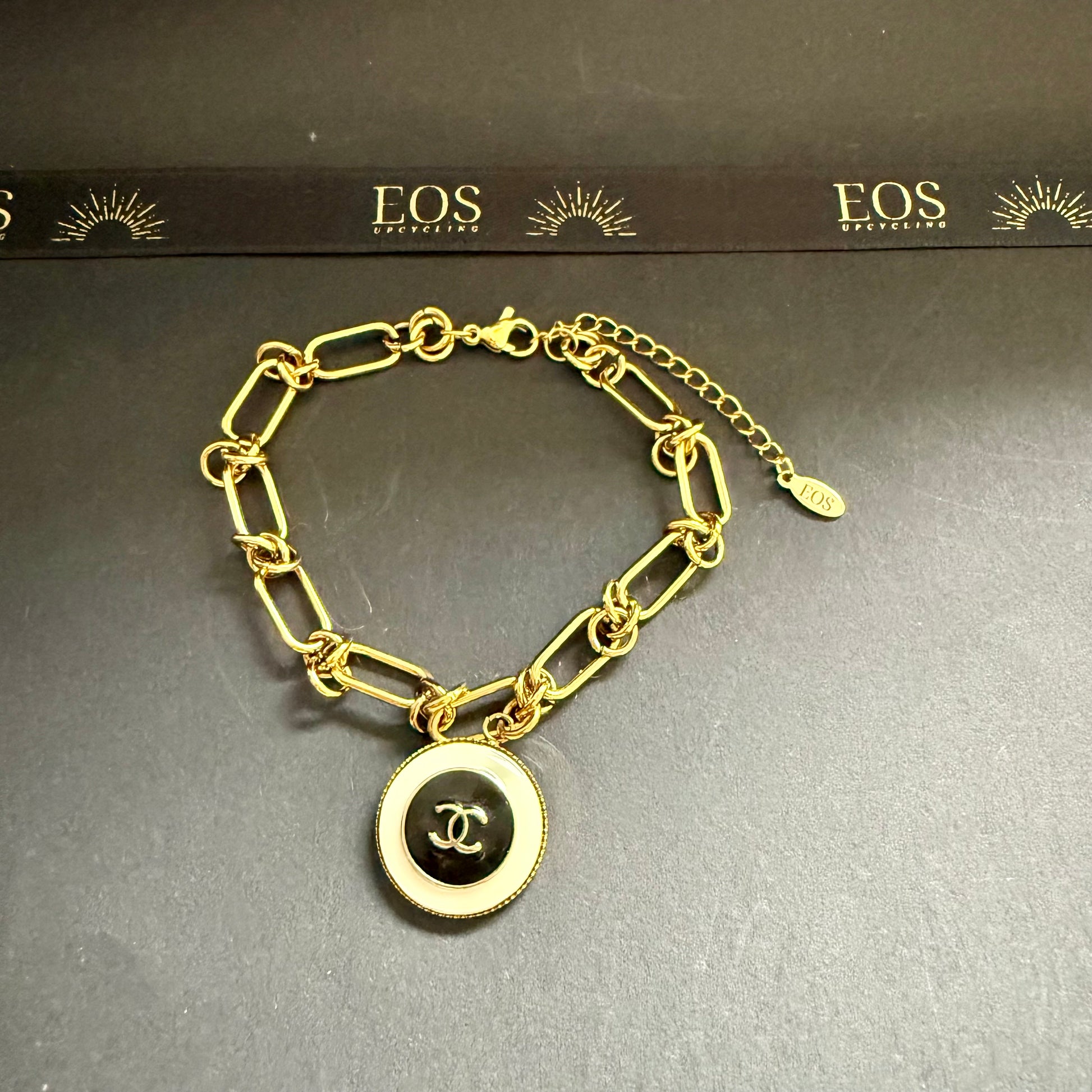 Authentic button from the luxury brand Chanel transformed into an upcycled bracelet with pendant, round button, black and white, with the iconic double C logo embossed.