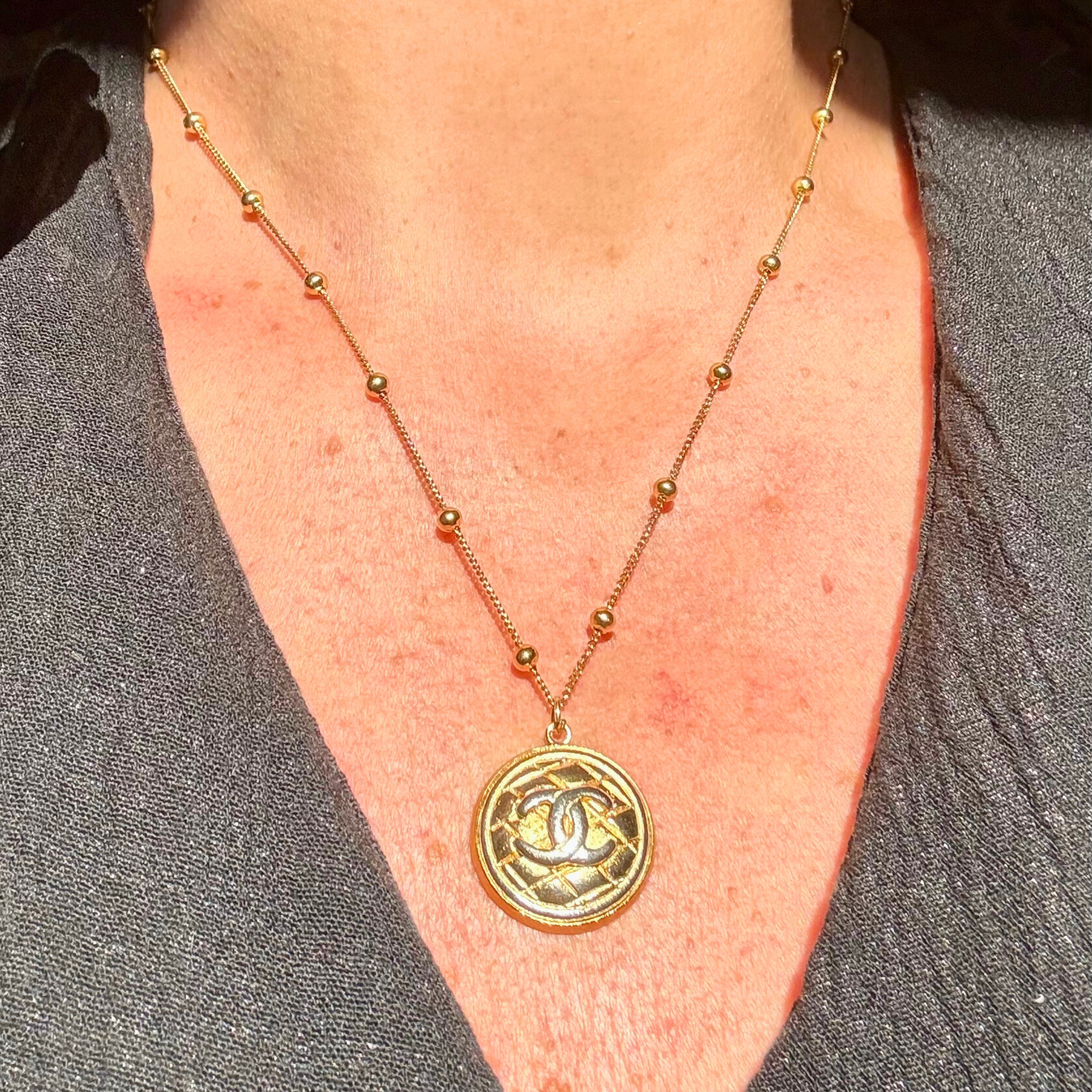 Botón auténtico de la marca de lujo Chanel transformado en un collar upcycled con colgante, botón redondo, de color dorado, con el icónico logo doble C en relieve.