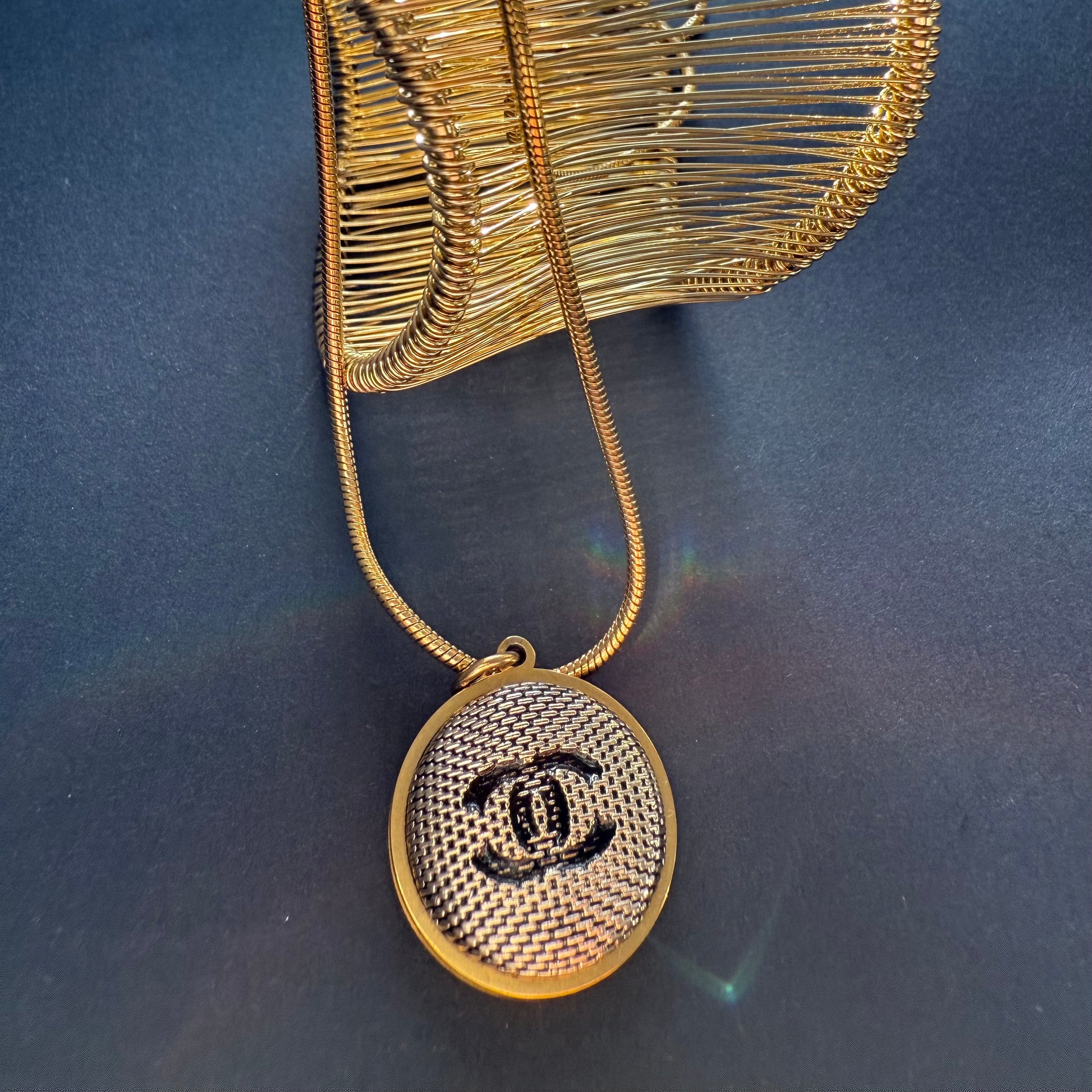 Botón auténtico de la marca de lujo Chanel transformado en un collar upcycled con colgante: botón redondo, de color dorado, con el icónico logo doble C incrustado en negro.