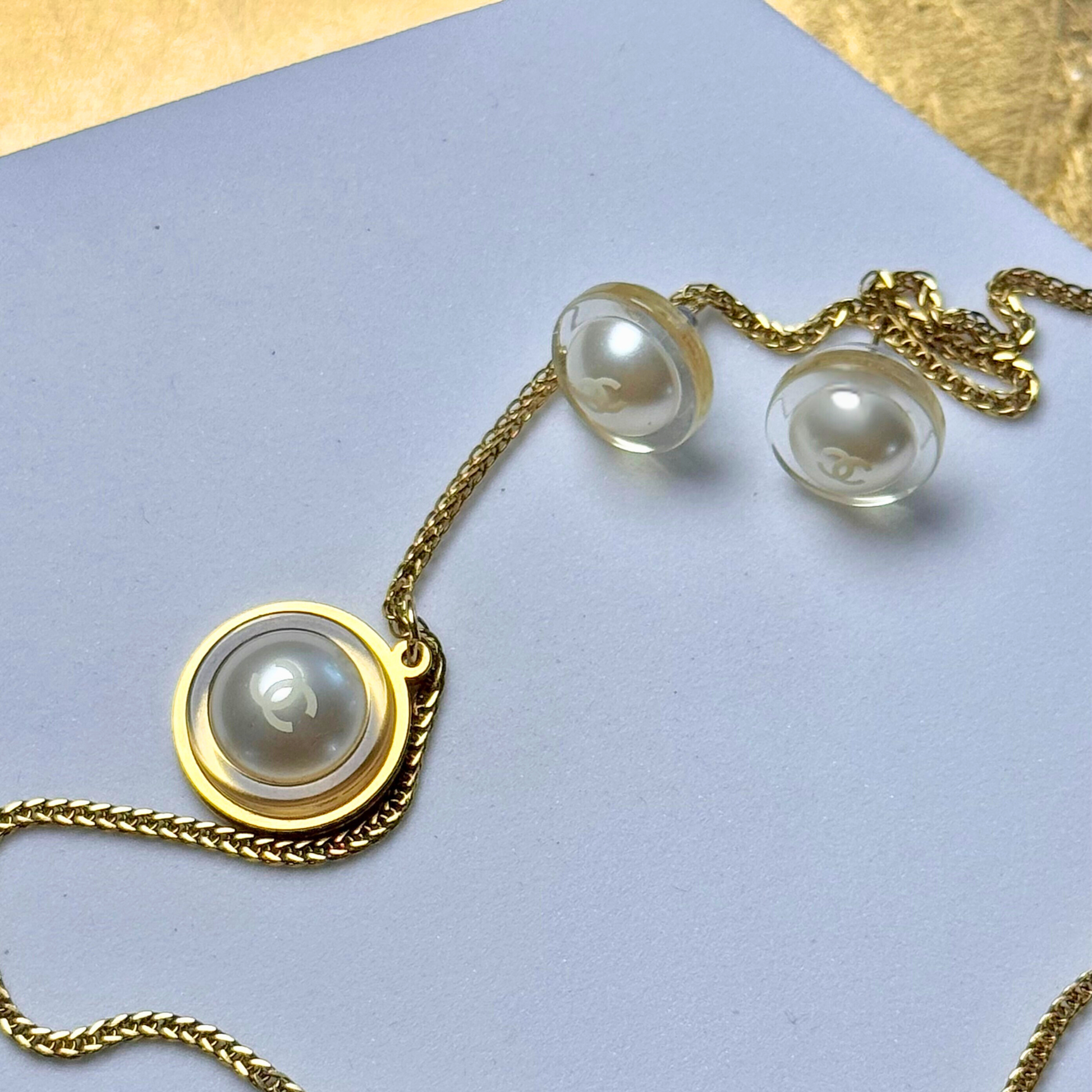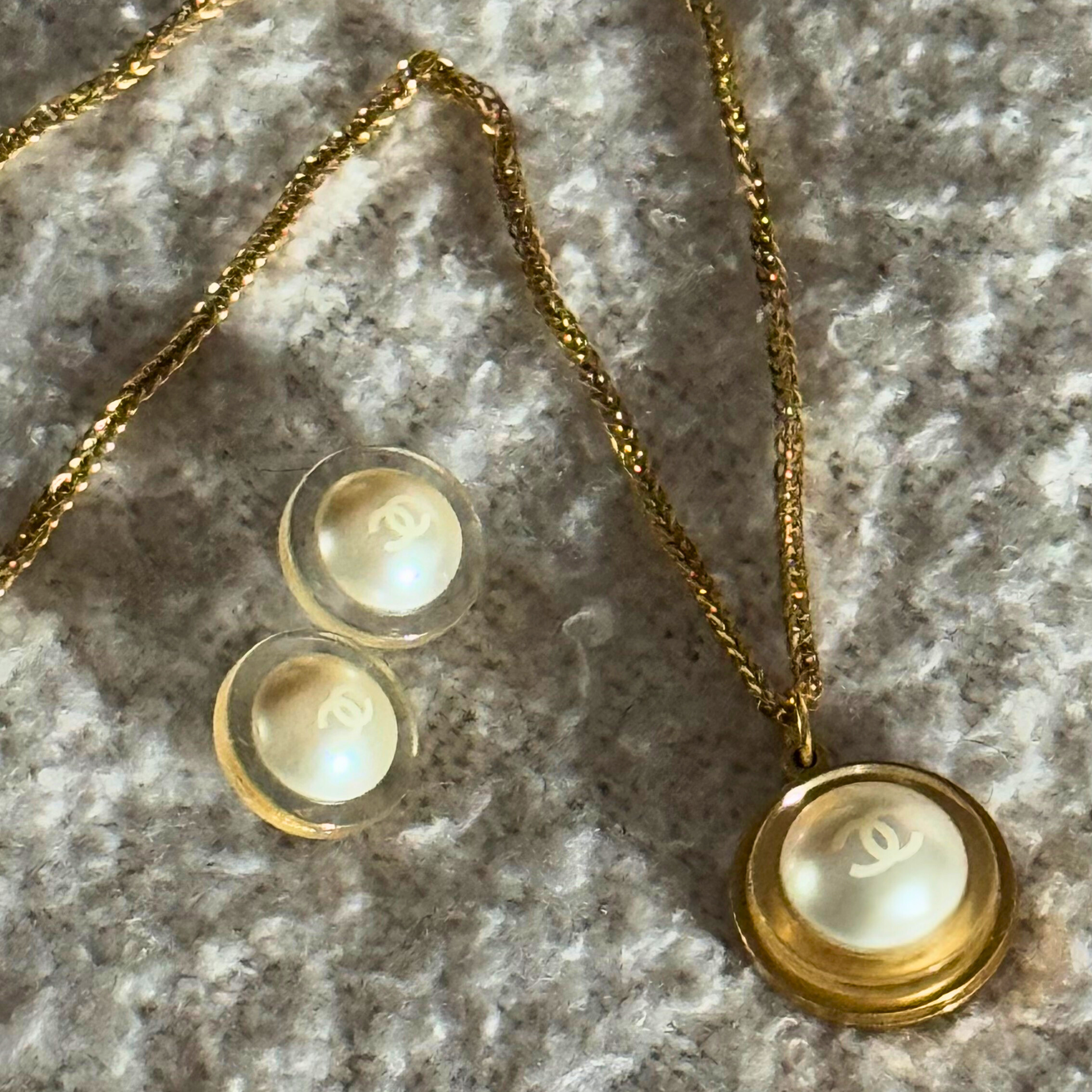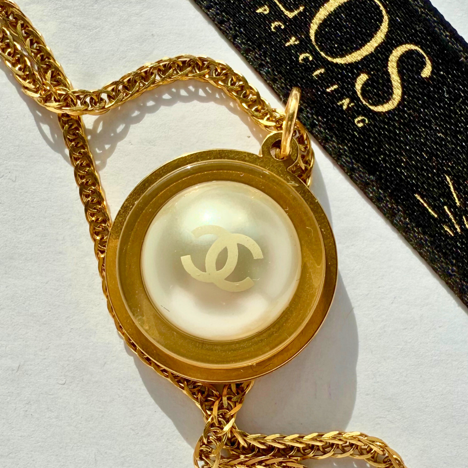 Un auténtico botón de la maison Chanel, transformado en un collar upcycled único. Su botón redondo y transparente deja ver una perla central con el emblemático doble C en blanco.