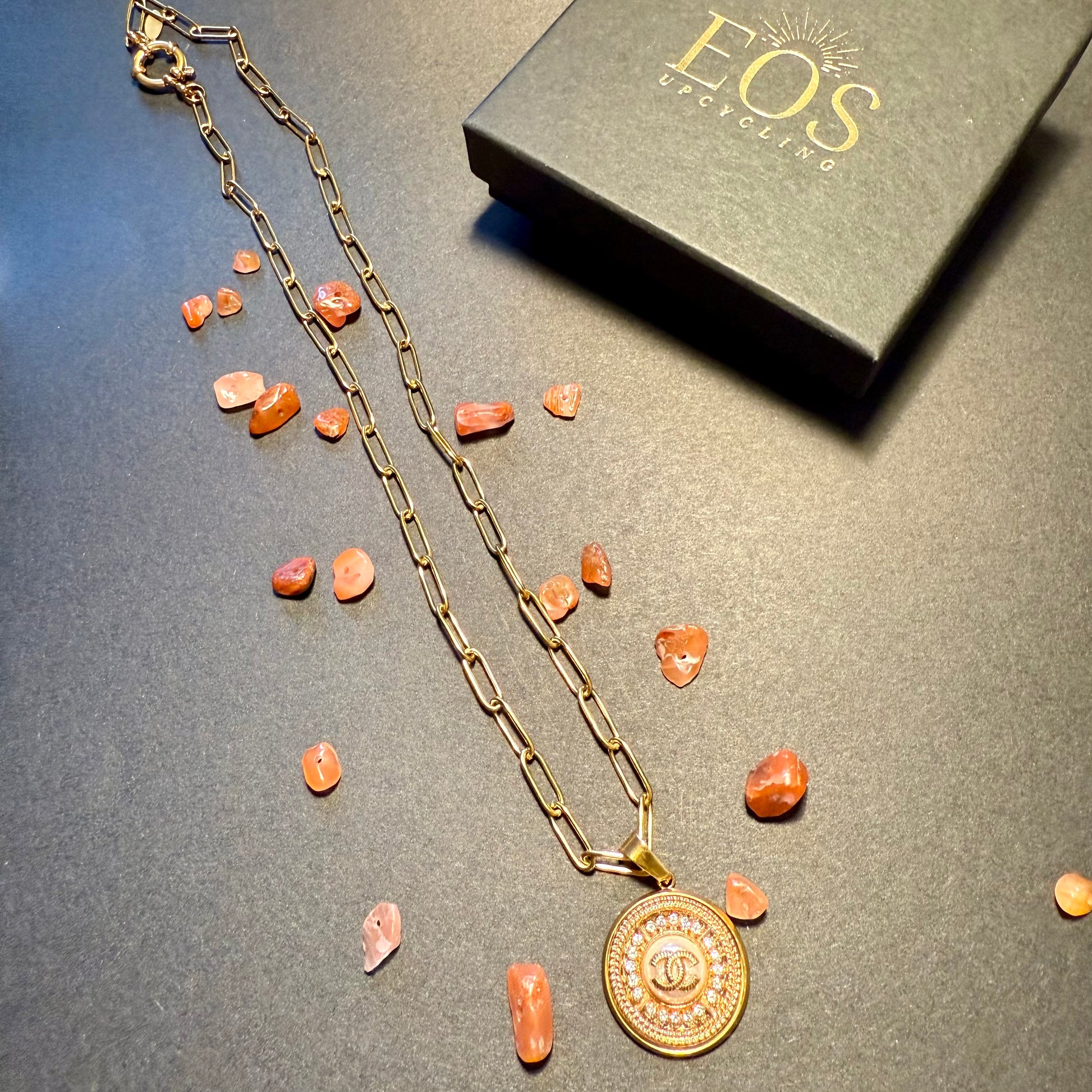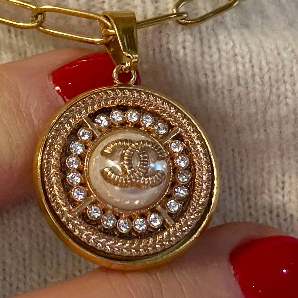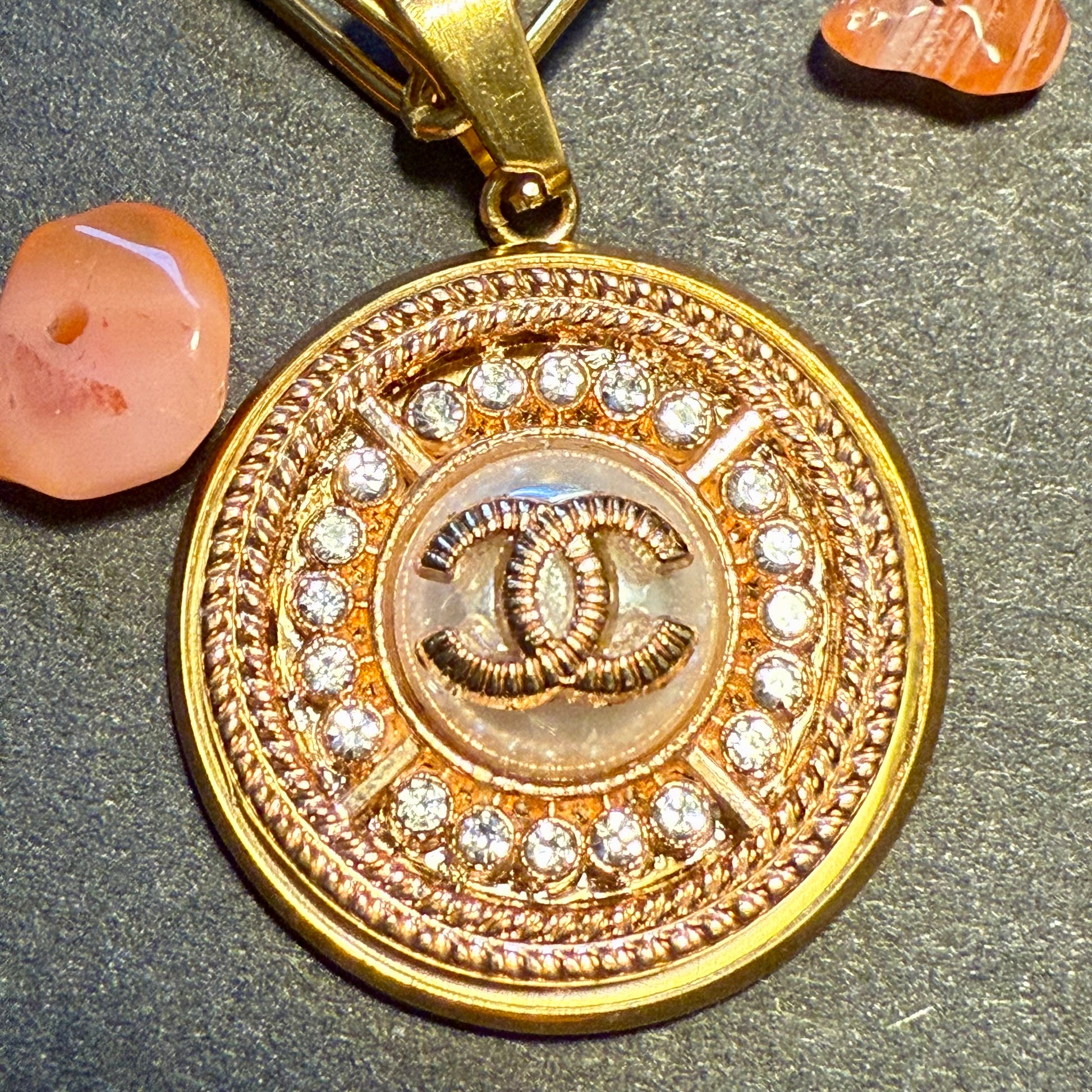 Botón auténtico de la marca de lujo Chanel transformado en un collar upcycled con colgante, botón redondo, de color dorado con strass, con el icónico logo doble C en relieve.