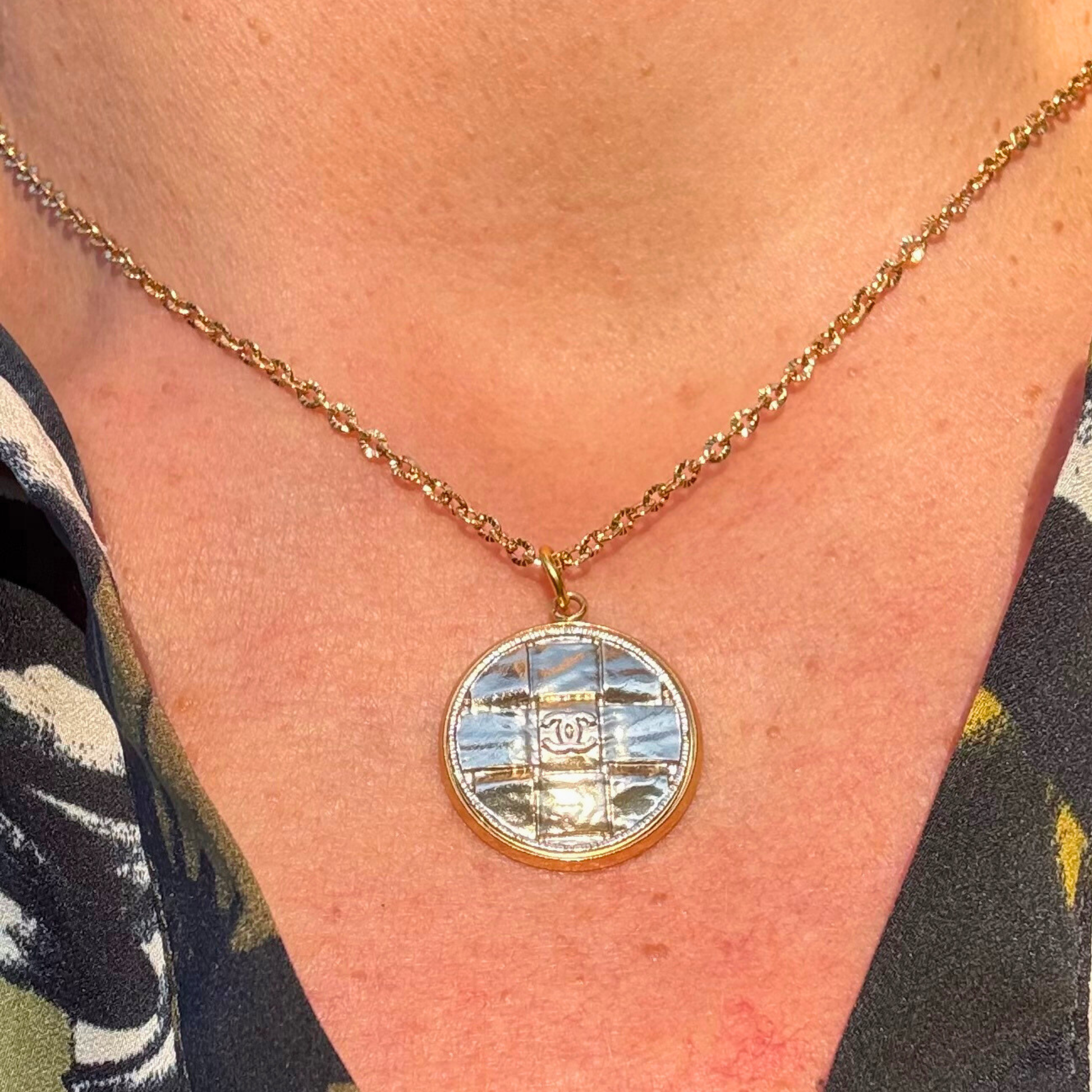 Botón auténtico de la marca de lujo Chanel transformado en un collar upcycled con colgante, botón redondo, de color dorado, con el icónico logo doble C en relieve.