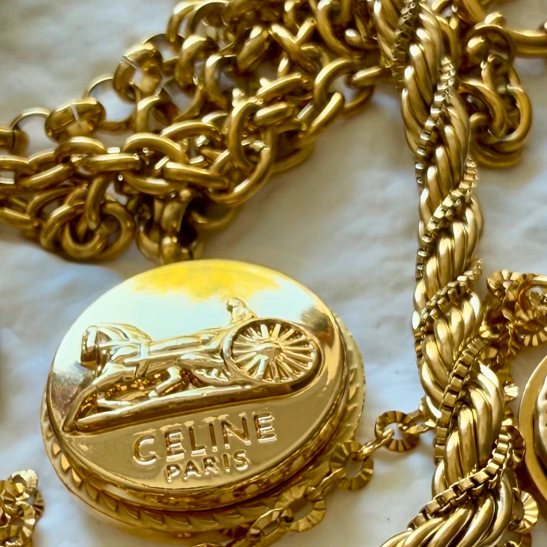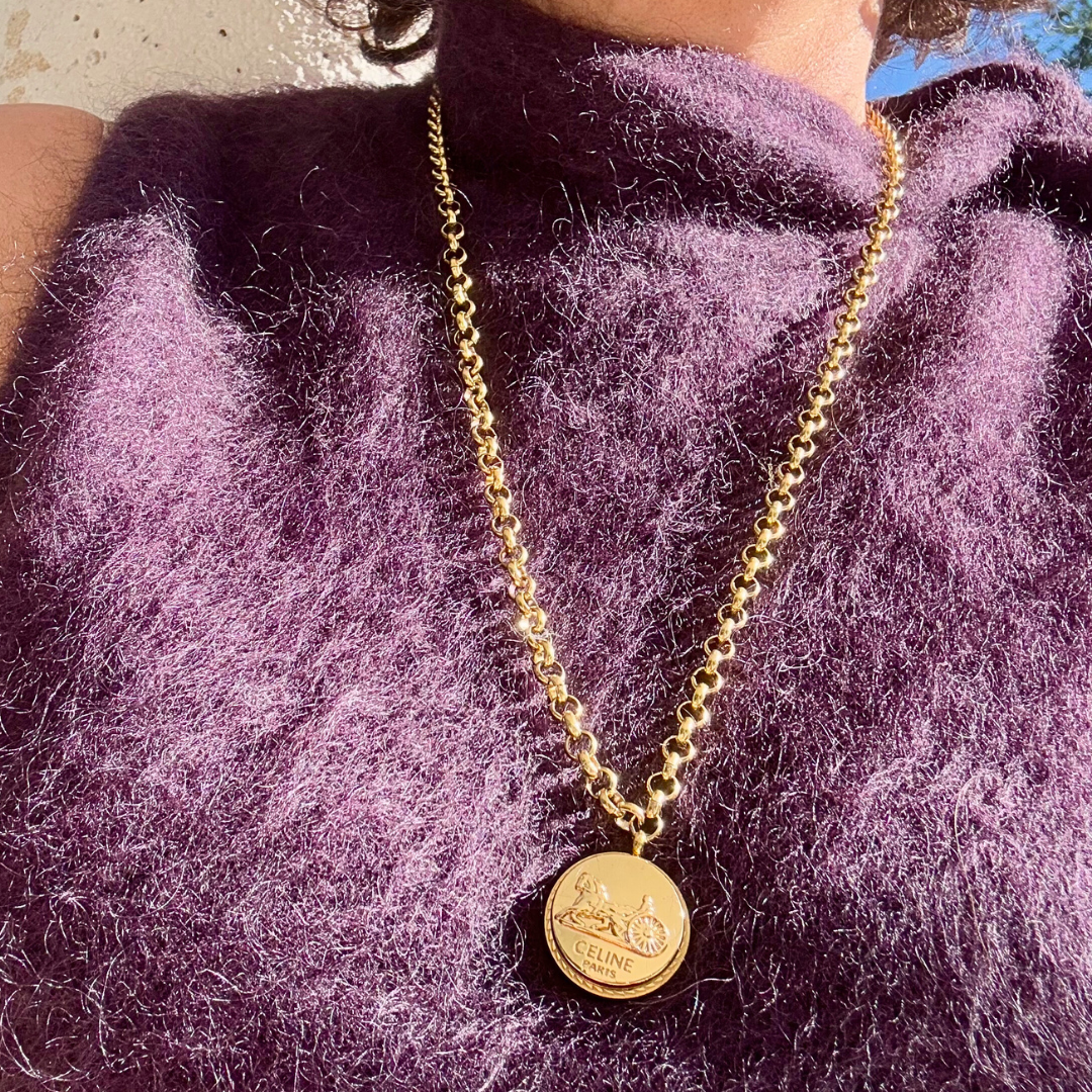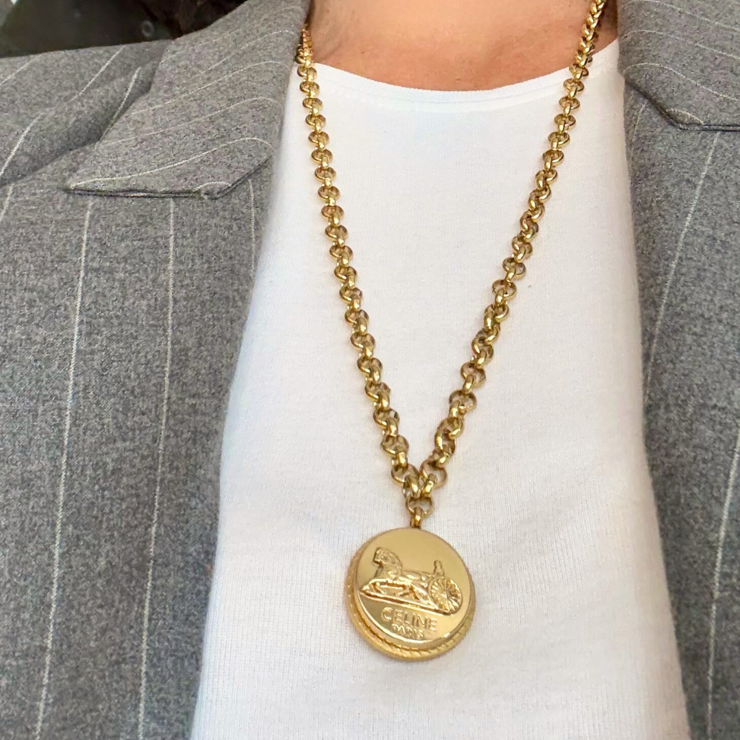Botón auténtico de la marca de lujo Celine transformado en un collar upcycled con colgante, botón redondo, de color dorado, con el icónico logotipo del carruaje de caballos de Celine.