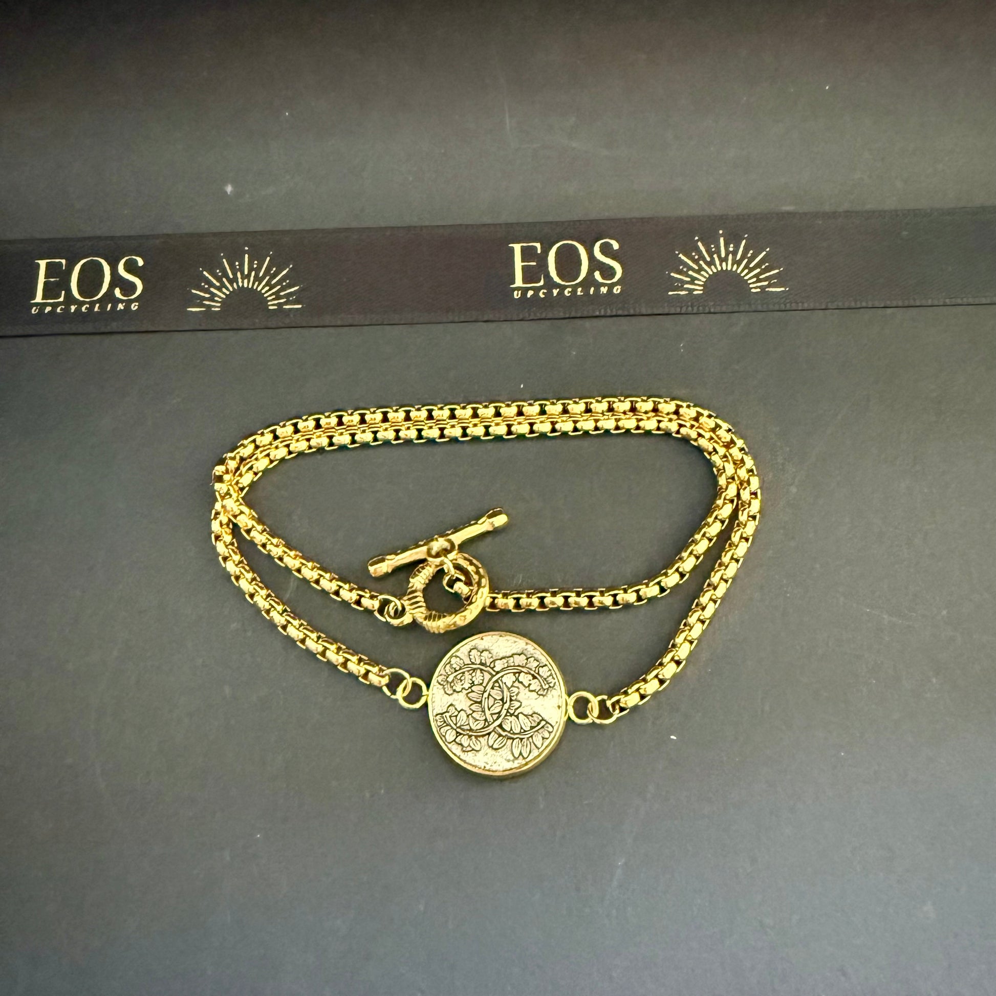 Botón auténtico de la marca de lujo Chanel transformado en una pulsera upcycled con colgante, botón redondo, de color dorado oscuro, con el icónico logo doble C.