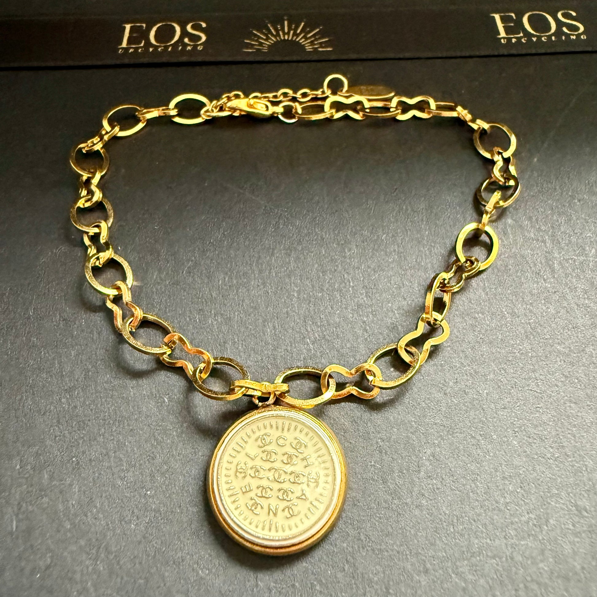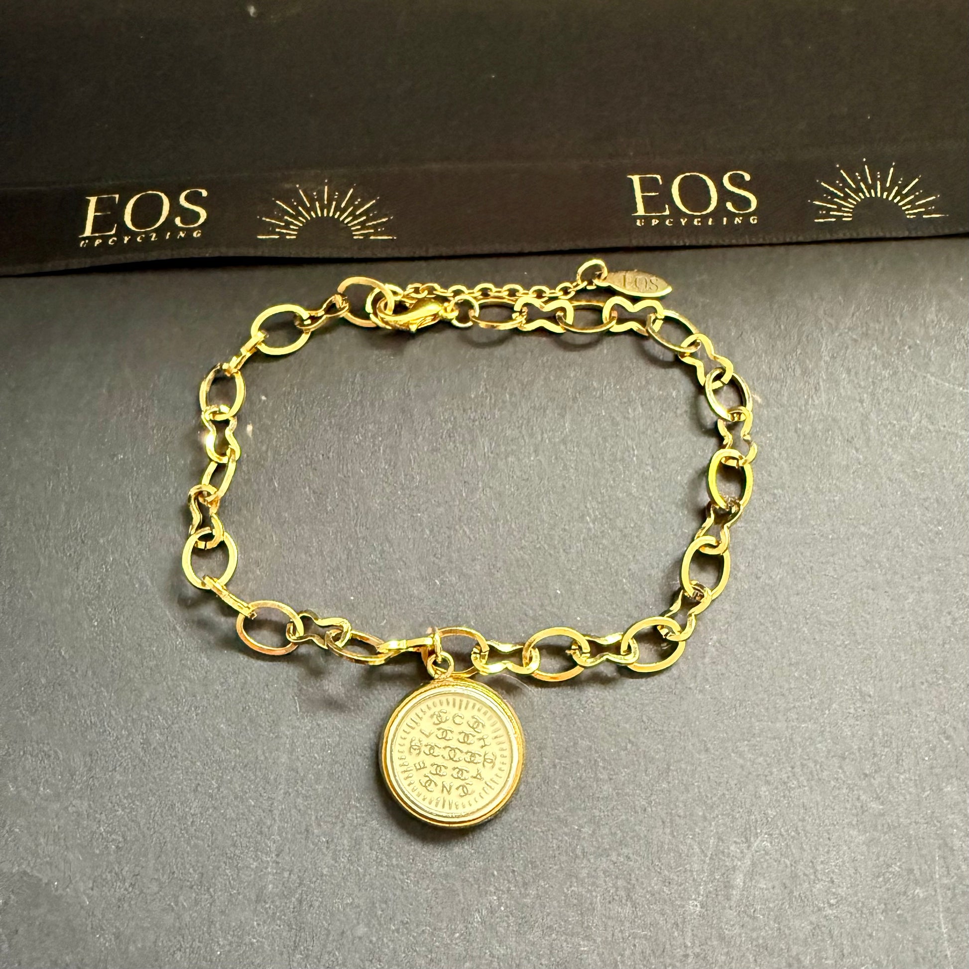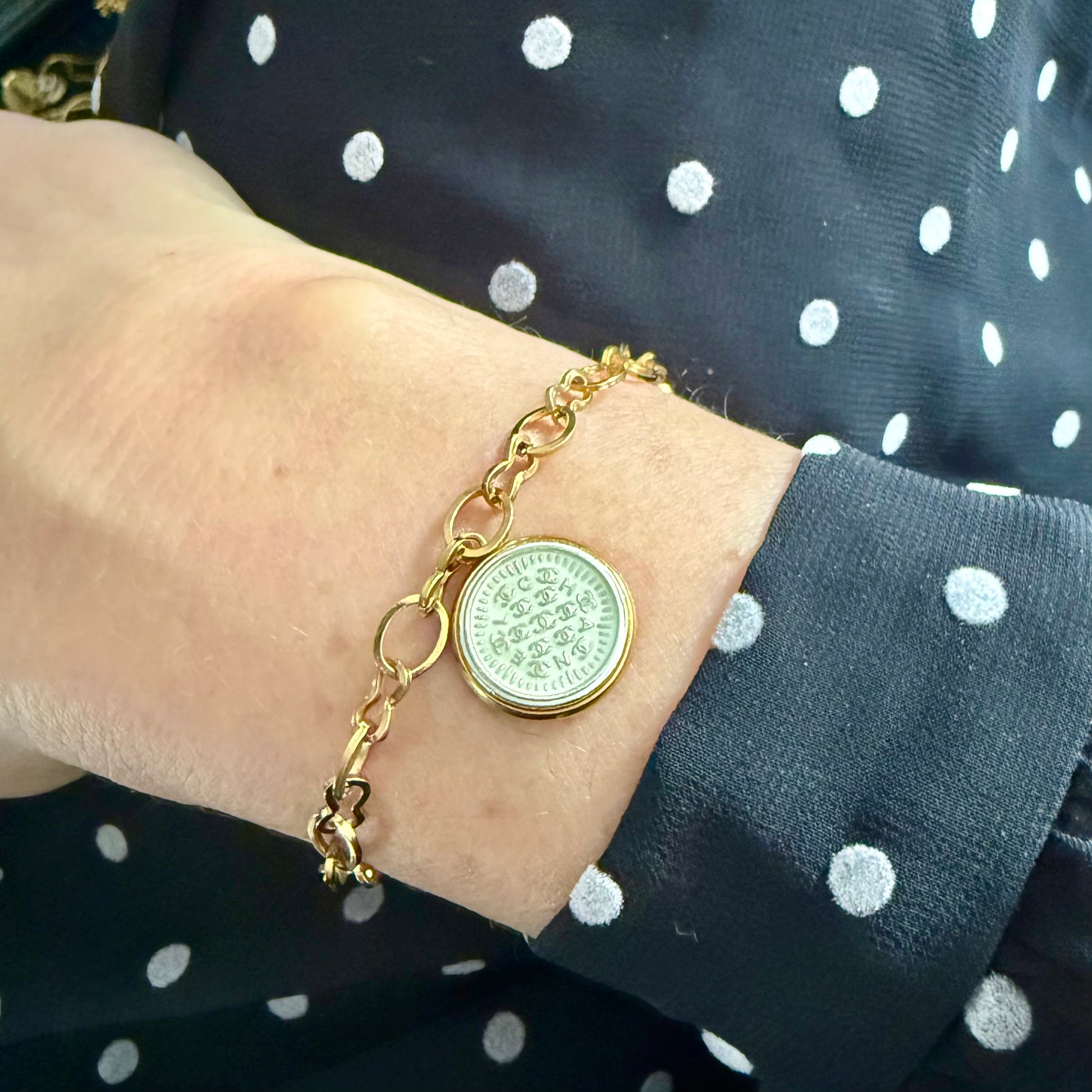 Botón auténtico de la marca de lujo Chanel transformado en una pulsera upcycled con colgante, botón redondo, de color blanco, con varios pequeños logos CC y las letras de la marca de alta costura.